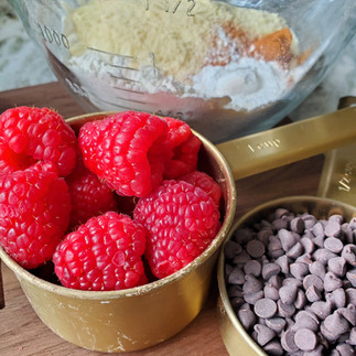 Fill each muffin cup 1/3 full. Add 1/2 the raspberries on top of each muffin. Repeat with remaining batter and raspberries.
