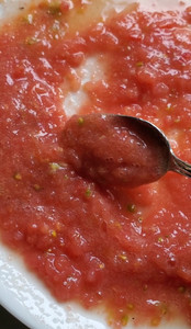 Stir in a good pinch of sea salt into the grated tomatoes. Set aside.